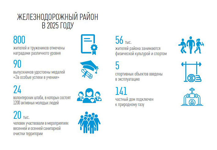 В 2025 году за участие в реализации молодёжной политики на территории Железнодорожного района и в связи с празднованием Дня молодёжи благодарностью администрации района были награждены более 20 представителей студенческой и рабочей молодёжи вузов, ссузов и предприятий, расположенных на территории района.