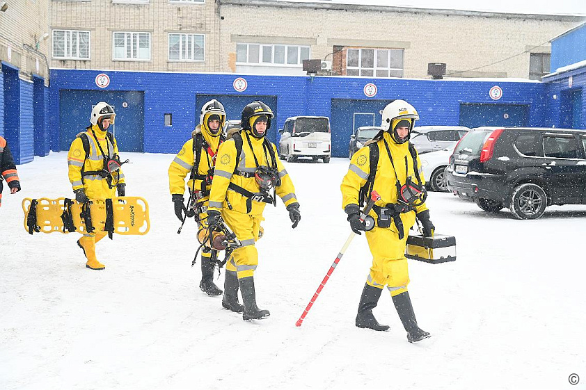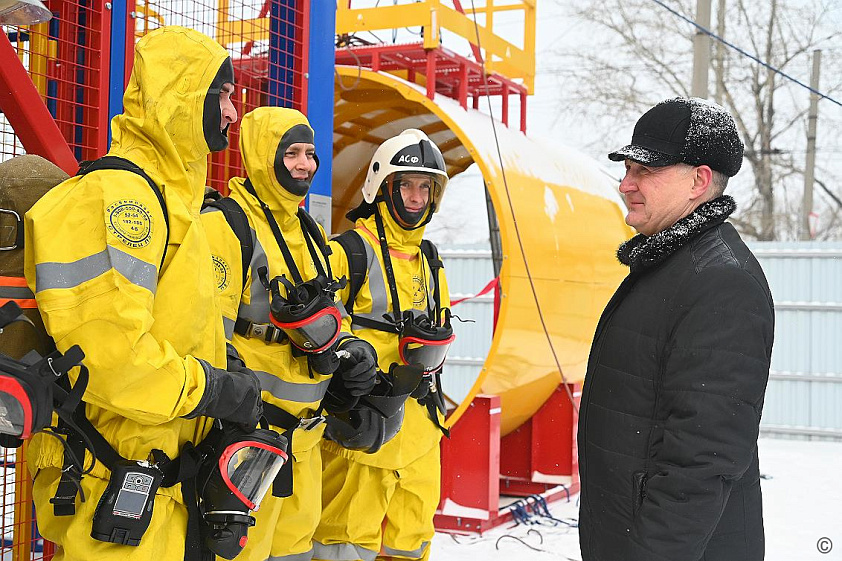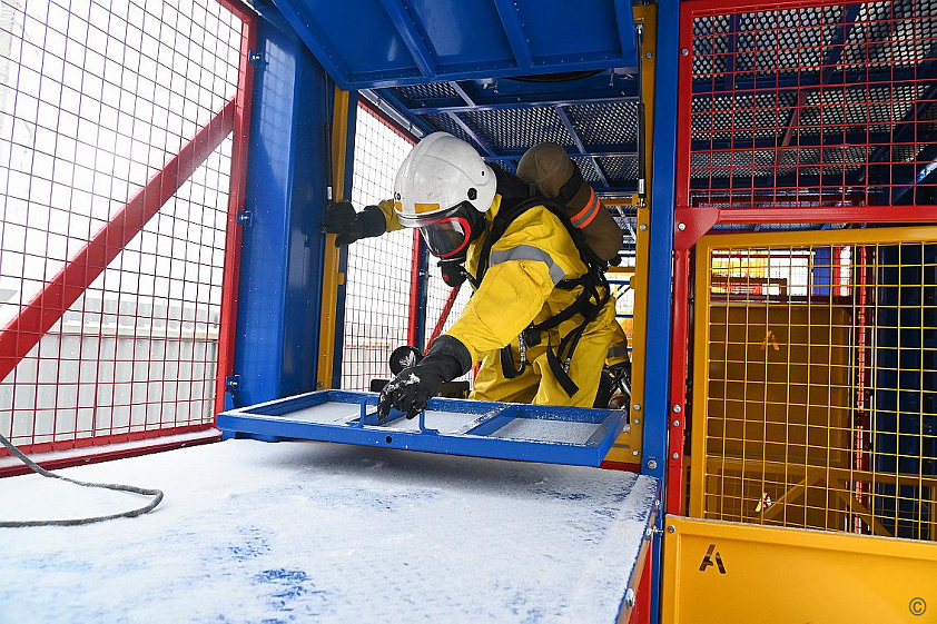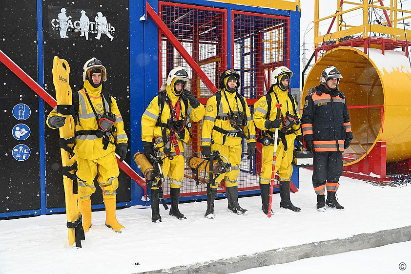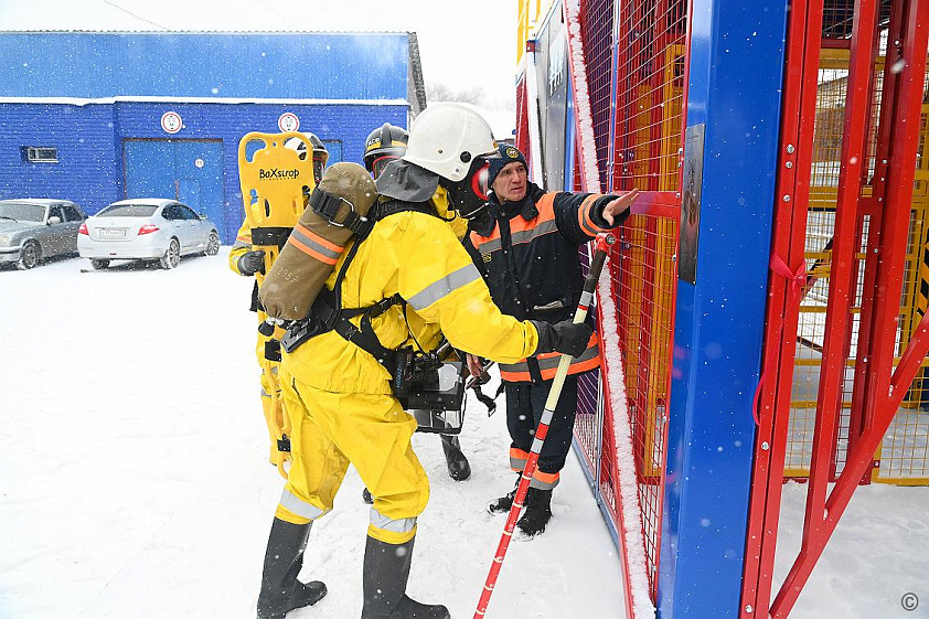 В завершении церемонии открытия тренировочного комплекса дежурная смена провела тренировку в полном снаряжении газоспасателей с использованием аппаратов для дыхания.