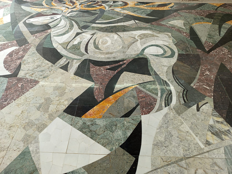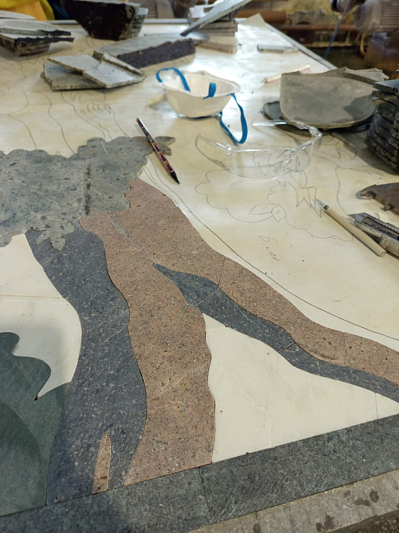 В качестве материала сибирские мастера выбрали белорецкий кварцит. Камень тёплого оттенка, от желтоватого до нежно-розового и кирпично-красного, украшен изысканными разводами холодных тонов.
