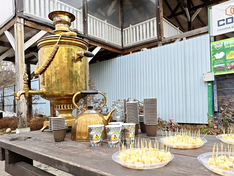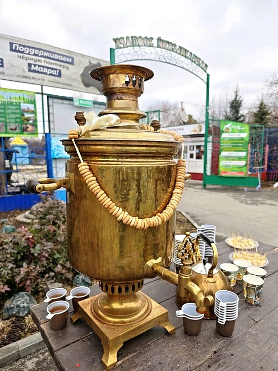Так как погода была прохладная, всех желающих угощали травяным чаем из самовара и мёдом в сотах.