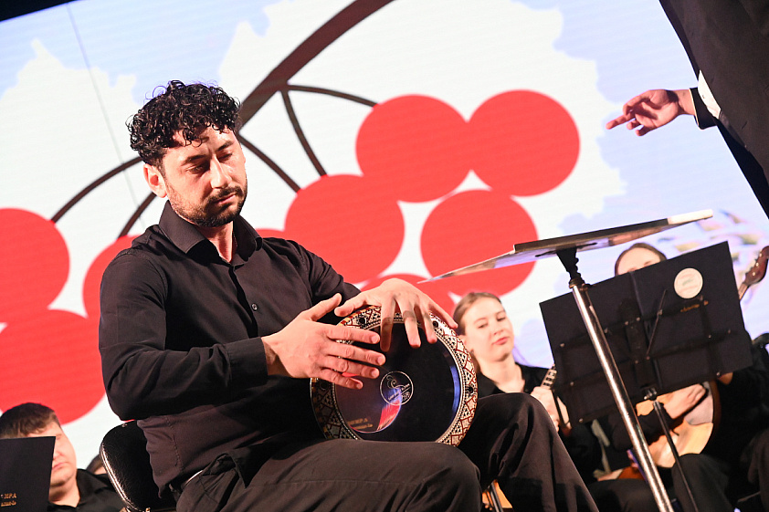Одним из ярких номеров этой обширной программы стало выступление оркестра русских народных инструментов АГИК под управлением Дмитрия Домошонкина вместе с музыкантом и педагогом Арутюном Давтяном, виртуозно владеющим дхолом — армянским барабаном, история которого насчитывает несколько тысяч лет.
