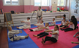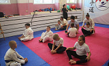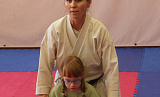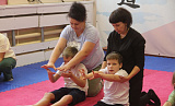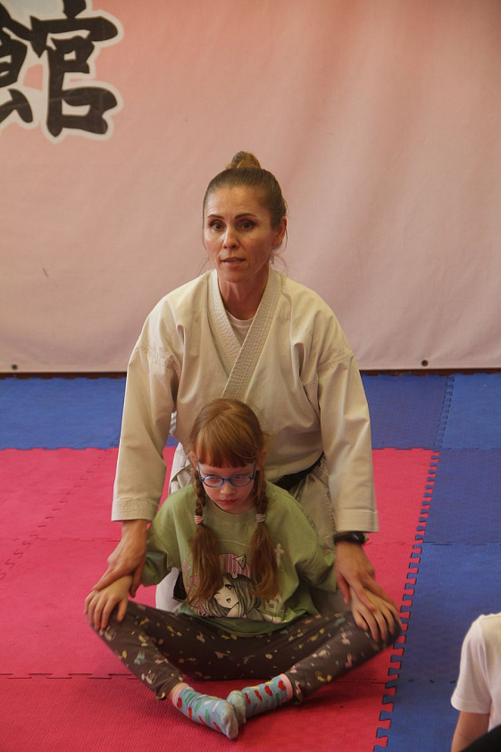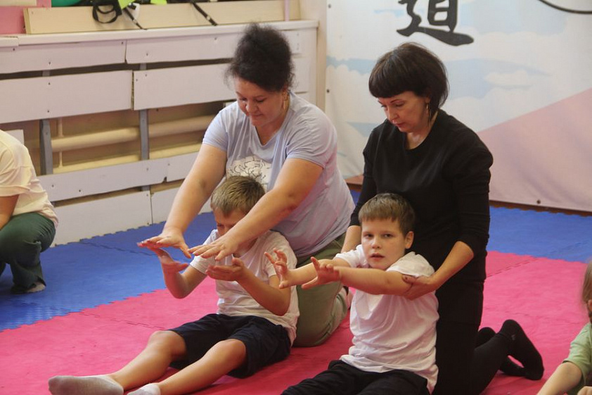 Тренировки групповые, по факту с каждым она работает индивидуально, находится не в центре татами перед группой, как на обычных занятиях, а внутри — кому положение рук поправит, кого на растяжку правильно усадит. Мамы детей тоже участвуют в процессе. А центральное место тренера в это время занимает её сын Роман Гладких-младший — юный обладатель синего пояса с самурайским спокойствием демонстрирует занимающимся, как правильно выполнять то или иное движение. И некоторые из ребят уже на него равняются.