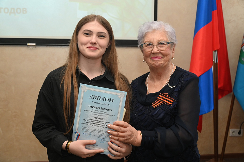 Наиболее интересные сочинения, по мнению членов жюри, представили студенты колледжа АГУ. Их героями стали родственники — участники Великой Отечественной войны и участники СВО. Например, герои сочинения Арины Кругляковой — это прапрадед Семён Никитович Дураков, защитник Отечества в годы войны, и отец — Александр Мерчаевич Татару, вставший на защиту Родины во время специальной военной операции и оставшийся на полях сражений.