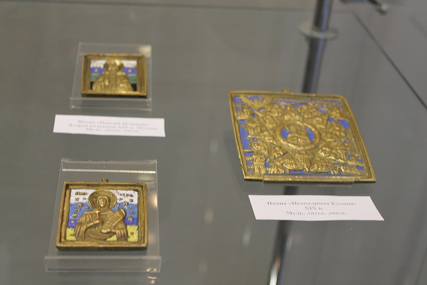 В витринах ГХМАК представлены одиннадцать предметов православного искусства. Среди них — памятники Невьянской иконописи, в том числе и так называемая врезка — произведение с врезанным в доску медным крестом, сочетающимся с живописными образами. Кроме того, здесь можно увидеть ранее не выставлявшиеся медные иконы XIX века московского и поморского происхождения. Двенадцатым и самым древним экспонатом выставки является шедевр книгопечатания — Евангелие XVI века, подлинную историческую и художественную ценность которого помог установить Сергей Москвин.