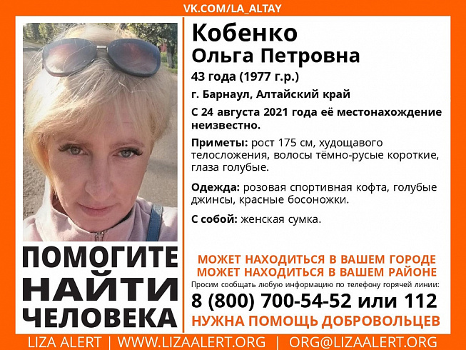 Местонахождение 43-летней Кобенко Ольги из Барнаула неизвестно с 24 августа 2021 года.