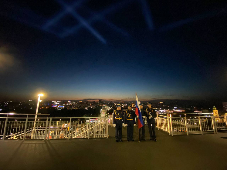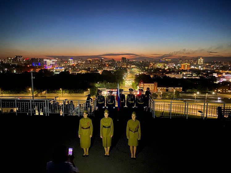 Военнослужащие почётного караула войсковой части 84686 торжественно открыли акцию, они выстроились на площадке лестницы. Песню «Журавли» исполнили волонтёры творческого объединения студентов «МОЛОДЁЖка» Алтайского педуниверситета.