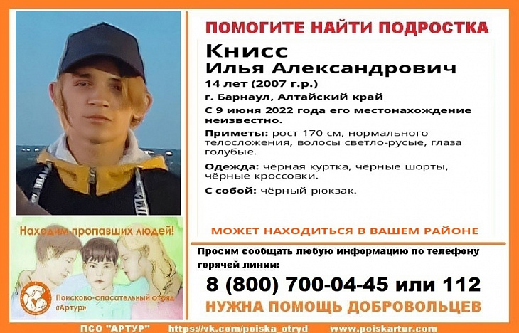 Волонтёры поисково-спасательного отряда «ЛизаАлерт» просят помощи в розыске 14-летнего подростка, пропавшего в Барнауле.