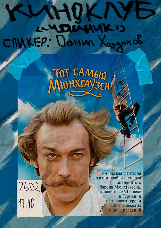 В визит-центре барнаульского парка «Изумрудный» 26 февраля в рамках работы киноклуба состоится просмотр трагикомедии Марка Захарова «Тот самый Мюнхгаузен». Кинопоказ могут посетить все желающие.