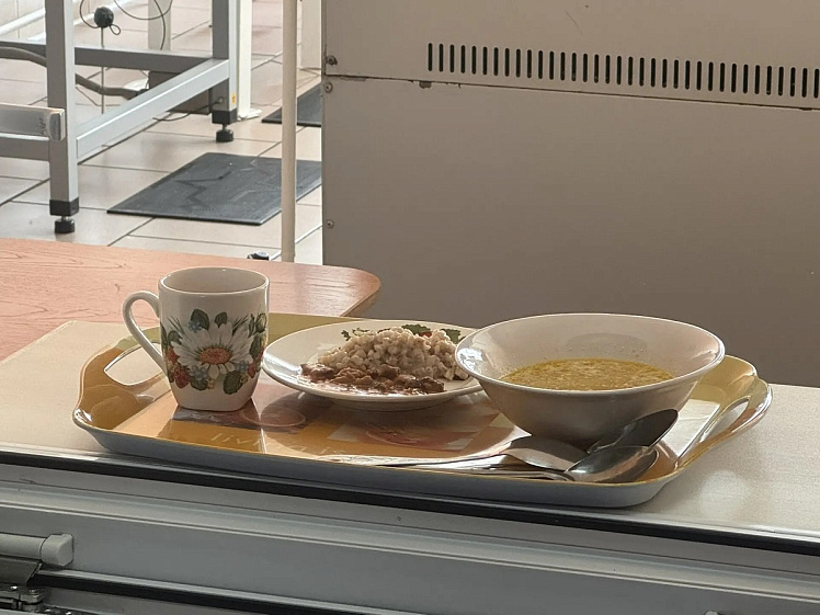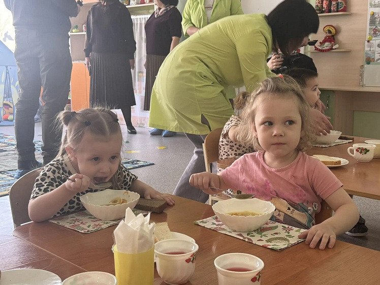 После осмотра групп комиссия поприсутствовала на обеде ребят. Сегодня их кормили овощным супом с мясом птицы, на второе был гарнир из перловой крупы, гуляш из говядины и свежие овощи. Дети кушали с удовольствием.
