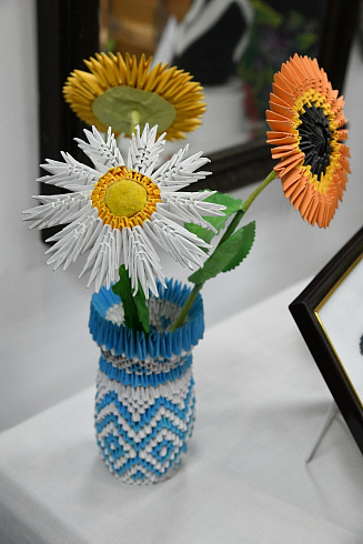 Надежда Воронцова — не единственная мастерица, чьи работы представлены в музее: выставка объединила сразу несколько творческих ветеранов труда, проживающих в микрорайоне школы № 125. Так, Людмила Комкова увлекается модульным оригами. На её витрине — забавный зелёный крокодил, грозный трёхглавый дракон и изящный лебедь. Людмила Афанасьевна рассказала, как долго она заготавливает элементы для поделки — их нужно сделать несколько сотен и только потом браться за сборку. Дети выразили желание освоить это направление творчества и предложили мастерице провести мини-мастер-класс.
