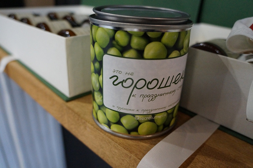 Кстати, существует ничем не доказанное поверье, что Новый год необходимо встречать в новом белье. Барнаульские мастерицы подготовили праздничные коллекции по этому поводу. На новогоднем маркете было представлено несколько марок. Креативно подошла к этой теме основатель бренда Secretum Velle Алёна Бондаренко. Она сама отшила праздничную коллекцию с оригинальными принтами, которые разрабатывает сама и наносит с помощью горячего пресса. К ним Алёна предложила нетривиальную упаковку — жестяные банки, оформленные под зелёный горошек и кукурузу. Однако этикетки предупреждают, что внутри не горошек, а подарок к празднику.