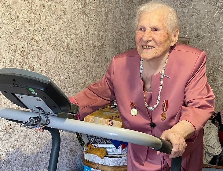 Мария Матвеевна с удовольствием показала, как уверенно тренируется на беговой дорожке кардиотренажёра, а ещё рассказала, что делает по утрам зарядку.