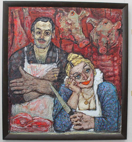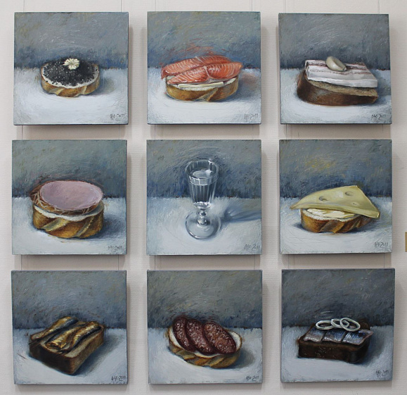 Что касается современного искусства, то на выставке оно представлено целым рядом авторов. Среди них — представитель большой династии грузинских художников Антон Тотибадзе. Из обширной серии его натюрмортов на выставке представлено вытянутое полотно «Только не забудь потом убрать за собой», напоминающее вывеску над трактиром. Есть здесь и полиптих «Энциклопедия бутерброда» Ольги Оснач, а также композиция из поленьев «Арбуз» Натальи Арендт. В витринах можно увидеть изделия из стали — своего рода памятники колбасе, лимону, капусте, хлебу, созданные Михаилом Дроновым и Константином Симоном.