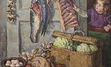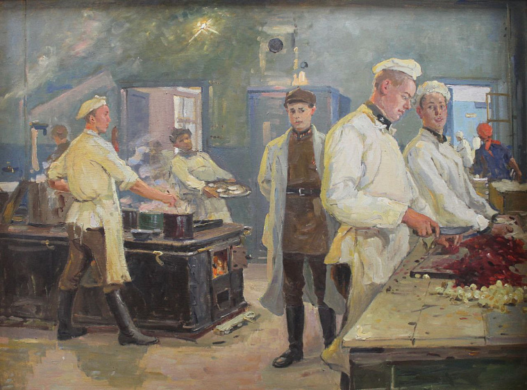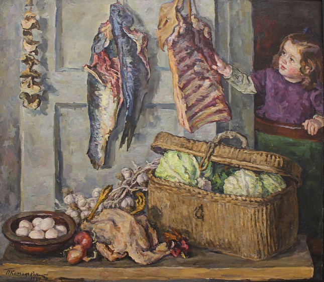 «На полотне „С московского огорода“, написанном в 1943 году Владимиром Одинцовым, не увидишь следов войны, — комментирует куратор выставки. — Изображённые овощи — это урожай москвичей, которые, стремясь выжить, разбивали в условиях города свои огороды. Часть этого урожая они должны были сдать для фронта».