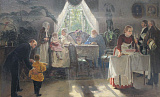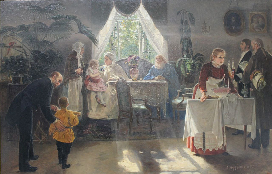 Затем наметилась другая тенденция — постепенно натюрморты стали частью сюжетной картины. К примеру, на полотне Андрея Попова «Демьянова уха», созданном по одноимённой басне Крылова, герой отказывается от очередной порции наваристой ухи, праздничное застолье запечатлено в работе Андрея Рябушкина «Ожидание новобрачных от венца в Новгородской губернии», а также на картине Алексея Корзухина «Бабушкин праздник».