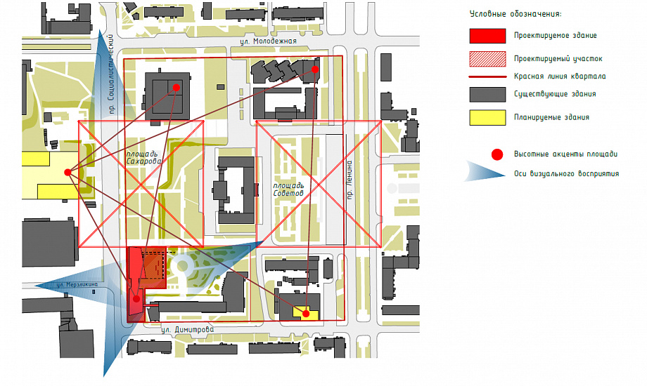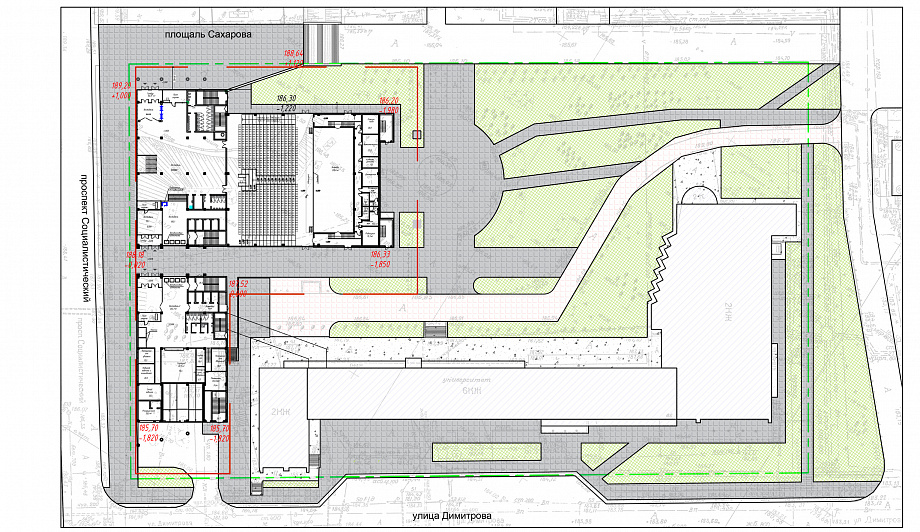 Одним из острых вопросов проекта было сохранение привычного для горожан прохода с улицы Мерзликина и проспекта Социалистического транзитом через сквер на проспект Ленина. Проход сохранён, его сделают по уровню первого этажа, сознательно идя на сокращение полезной площади здания. Ширина прохода — 12 метров. В целом новый комплекс станет частью мини-студенческого городка в центре Барнаула и, по мнению разработчиков и заказчиков, украсит собой Барнаул.