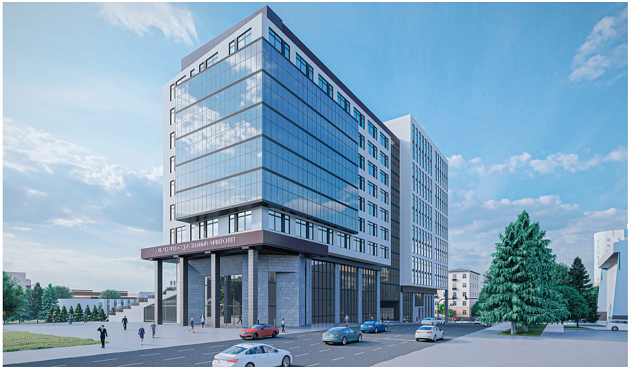По словам архитектора Александра Деринга, перед разработчиками стояла непростая задача, ведь проект сложный по семантике и расположению в сложившемся градостроительном пространстве. В результате идеи, которые были заложены заказчиком — руководством вуза и Министерством образования, — вылились в следующее. По проекту здание будет состоять из двух 11- и 12-этажных корпусов (северного и южного), соединённых рекреацией. На втором этаже запланированы столовая, библиотека и другие общественные пространства. В северном корпусе разместят лекционные аудитории на 150–300 мест и большой актовый зал на 700 человек. Изюминкой корпуса станет заглублённый концертный зал с зелёной эксплуатируемой крышей, чтобы здание лучше вписалось в пространство существующего сквера. Летом её можно будет использовать для проведения концертов или других уличных мероприятий. В южном блоке запланированы современные лаборатории и кабинеты сотрудников университета. Со стороны улицы Димитрова по проекту должна разместиться подземная двухуровневая парковка на 136 машино-мест, что превышает требуемые нормативные показатели. Общая площадь объекта составит 36,7 тысячи квадратных метров. Новое здание планировалось соединить с существующим корпусом Д двухуровневым переходом.