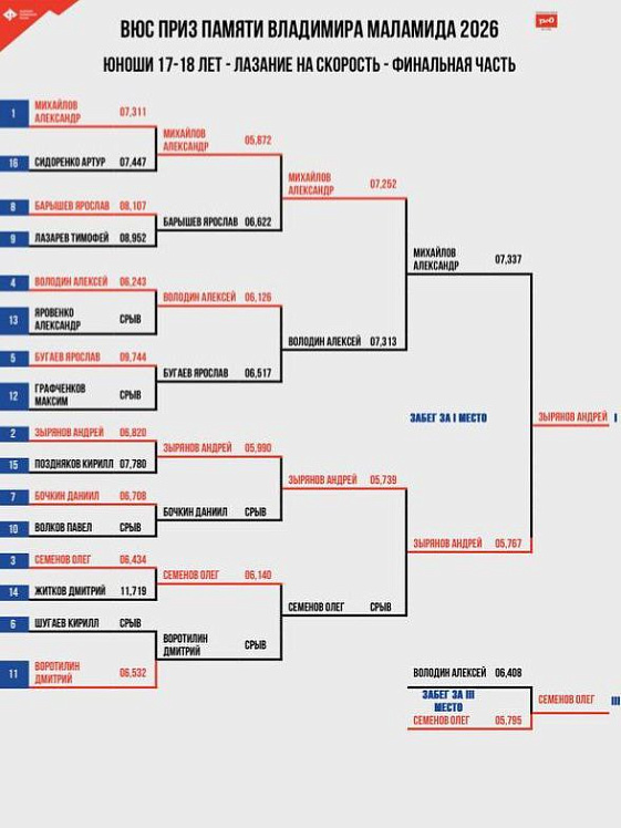 Алтайский спортсмен стал лучшим в «скорости», а также обновил рекорд, преодолев дистанцию за 5,739 секунды. Тренирует победителя Ксения Катунина.