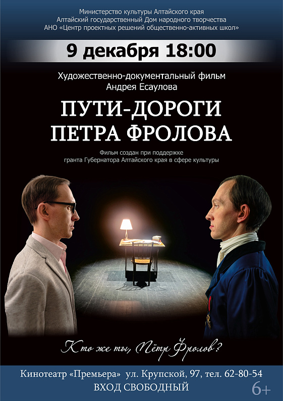 9 декабря в 18:00 в барнаульском кинотеатре «Премьера» состоится презентация художественно-документального фильма «Пути-дороги Петра Фролова». Кинокартина повествует о ключевых моментах жизни выдающегося горного инженера, новатора и руководителя Колывано-Воскресенских заводов.