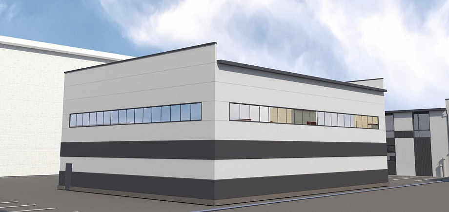 Гараж будет одноэтажным, но высоким — высота до ферм перекрытия семь метров. В здании будет четверо ворот и ленточное остекление по главному фасаду.