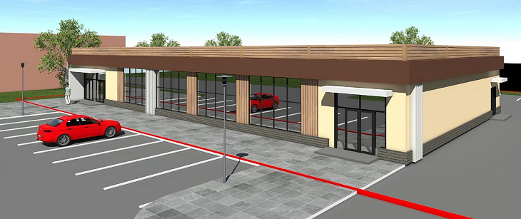 Напомним, проект предполагает возведение одноэтажного здания из металлического каркаса с облицовкой сэндвич-панелями в тёплых бежево-коричневых тонах. Парковки изначально были размещены перпендикулярно проезжей части. Ночная подсветка будет подсвечивать зелёный фриз вдоль всего здания и входные группы.