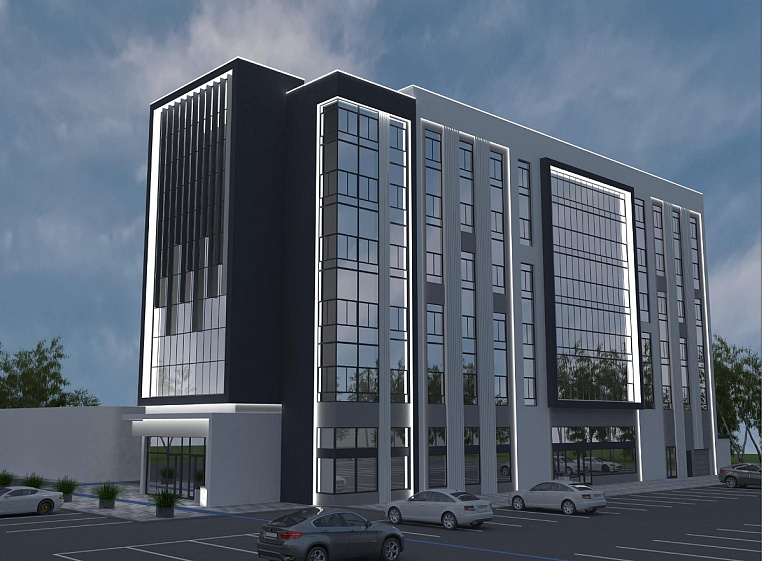 Фасад существующего здания также изменят. Он сохранит тёмно-серую стилобатную часть, белый штукатурный фасад дополнят объёмными элементами для улучшения светотеневых акцентов. Вечерняя подсветка будет подчёркивать вертикальное членение обоих зданий.