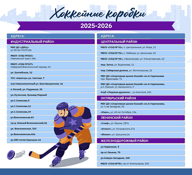 Всего в столице Алтайского края функционирует 16 катков, 11 лыжных баз и 33 хоккейные коробки. Их адреса указаны в прикреплённых ниже карточках — выбирайте ближайший и скорее отправляйтесь, чтобы хорошо провести время на свежем воздухе.