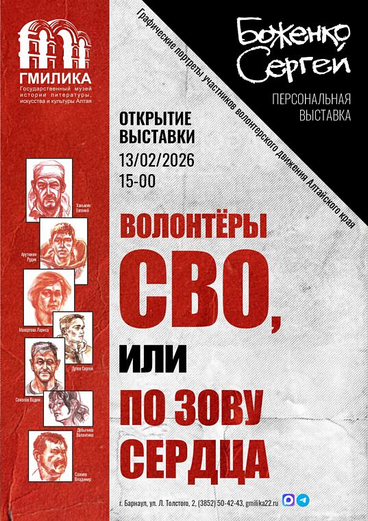 На открытии выставки выступят её герои — волонтёры. Помимо этого Сергей Боженко расскажет о своей работе. Слово также предоставят автору текста альбома о выставке «Волонтёры СВО, или По зову сердца» — заместителю директора по научной работе ГМИЛИКА Елене Огневой.
