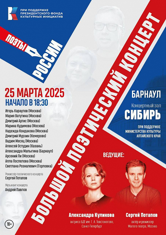 Так, в Барнауле выступят московские авторы: Игорь Караулов, Мария Ватутина, Дмитрий Артис, Марина Кудимова, Надежда Кондакова, Вадим Месяц. Они прочитают свои тексты, написанные после 22 февраля 2022 года, а также уже известные стихи. Свои произведения исполнят и литераторы из Казани, Кемерова, Барнаула и Горловки.