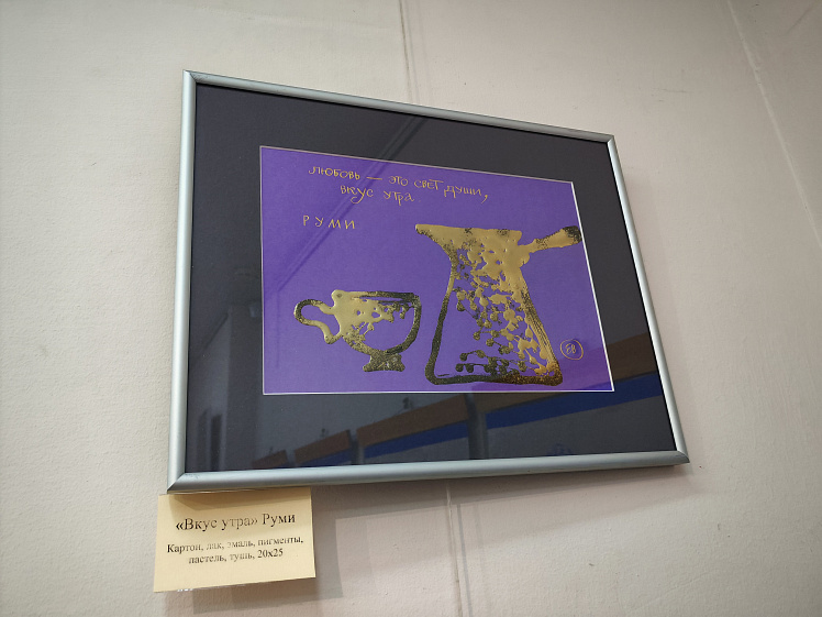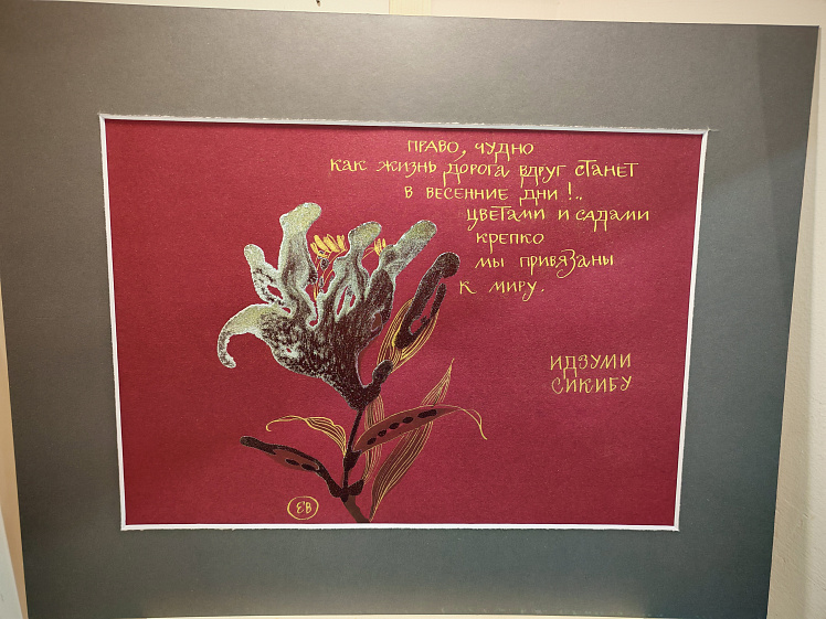 Все представленные на выставке работы можно объединить в серии. Так, графика выполнена на цветном картоне. Металлическим пигментом изображены цветы, овощи, силуэты людей, которые сопровождают хокку — трёхстрочные стихотворения японских авторов. Каждое из них можно расценивать как послание, заставляющее задуматься. Вот Татибана Акэми пишет: «Немного мне нужно: один понимающий друг для умной беседы да один пейзаж по соседству, чтобы только им любоваться…». Или Басё напоминает: «Жди лучших дней, но знай: в чистой душе слива цветёт и зимой…».
