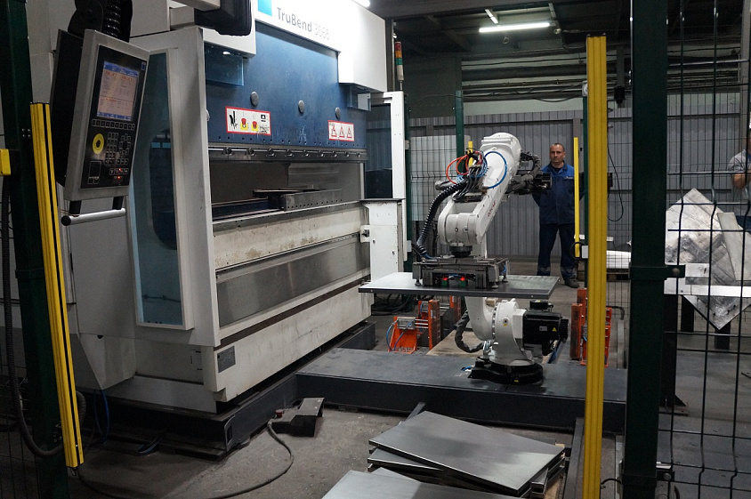 Мы видим, как робот без устали берет лист металла, подает на гибочный инструмент, затем забирает оттуда готовую деталь и укладывает ее на поддон. Оператору остается лишь контролировать процесс нажатием кнопки, организовывать систему подвоза-увоза деталей. Как рассказали на предприятии, листогибочный станок изначально не был роботизирован, барнаульские Кулибины изготовили отдельную раму, поставили робота, листогиб и объединили их в единую систему.