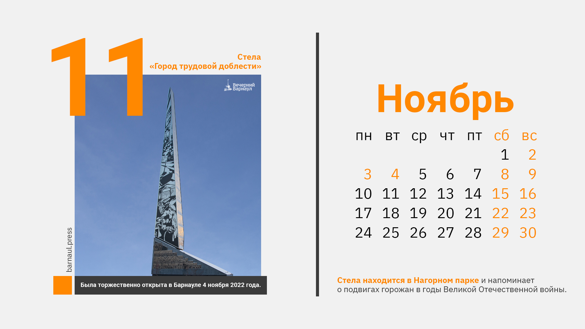 Сегодня мы публикуем календарь на ноябрь 2025 года. Кроме дат на нём изображена стела «Город трудовой доблести», подробнее о которой вы можете узнать по ссылке.