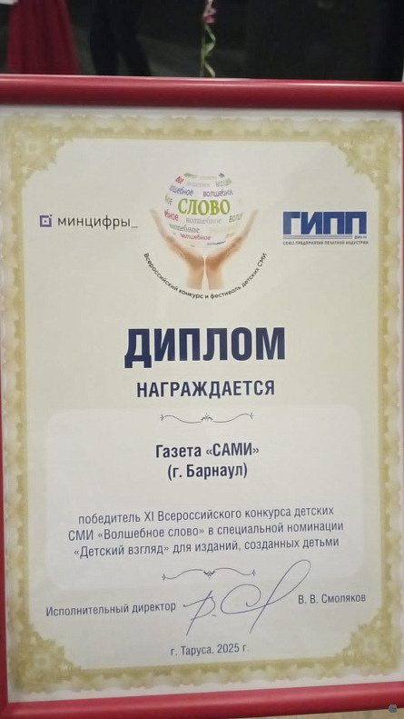 1 октября в городе Таруса прошла церемония награждения победителей XI Всероссийского конкурса детских СМИ «Волшебное слово». Лауреатом в номинации «Детский взгляд» стала барнаульская детско-юношеская газета «САМИ».