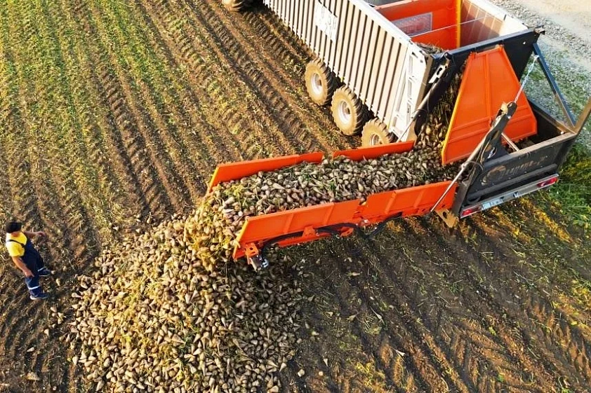 Это навесное оборудование на многофункциональный полуприцеп, предназначенное для бережной погрузки свёклы и других корнеплодов. Прицепы принимают свёклу, перевозят её и перегружают в самосвалы, исключая при этом простой комбайнов. В результате уже проведённых испытаний производительность уборки сахарной свёклы выросла в полтора-два раза. Такой подход минимизирует потери времени и топлива, делая процесс уборки проще и удобнее для работников сельскохозяйственных предприятий.