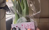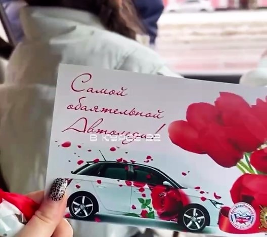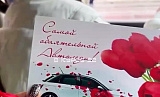 Девушки, сидящие на пассажирском сиденье, сняли видео, в момент, когда сотрудники поздравляли автоледи с 8 Марта.