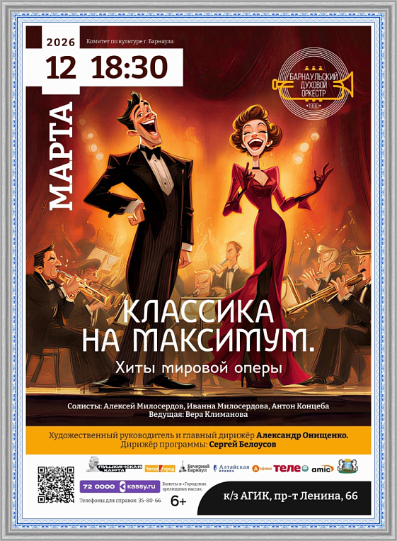 В концертном зале Алтайского государственного института культуры 12 марта состоится программа «Классика на максимум. Хиты мировой оперы». Зрители услышат легендарные арии и ансамбли из знаменитых опер в исполнении Барнаульского духового оркестра.
