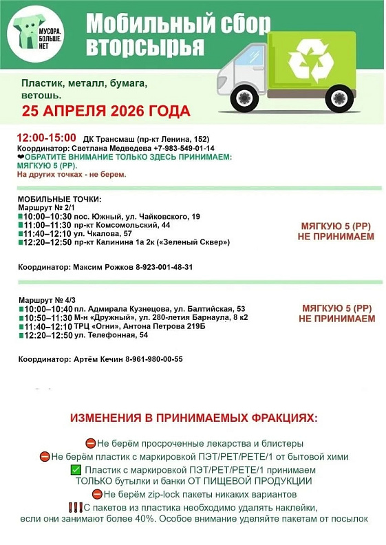 В субботу, 25 апреля, в Барнауле состоится экологическая акция по раздельному сбору отходов «Разделяя — сохраняй!». Её традиционно проводит НКО «Мусора.Больше.Нет» при поддержке комитета по благоустройству города Барнаула.