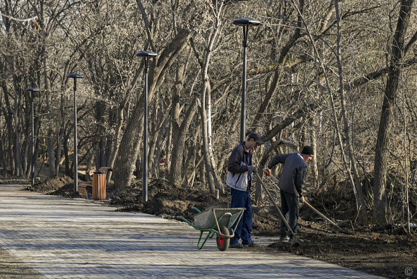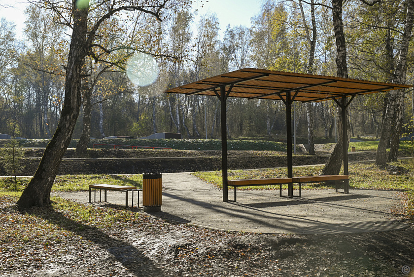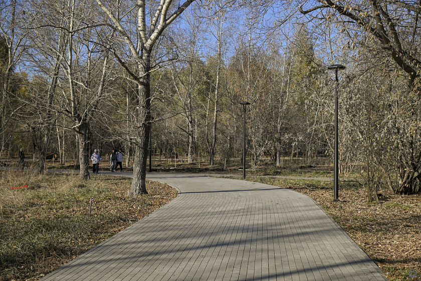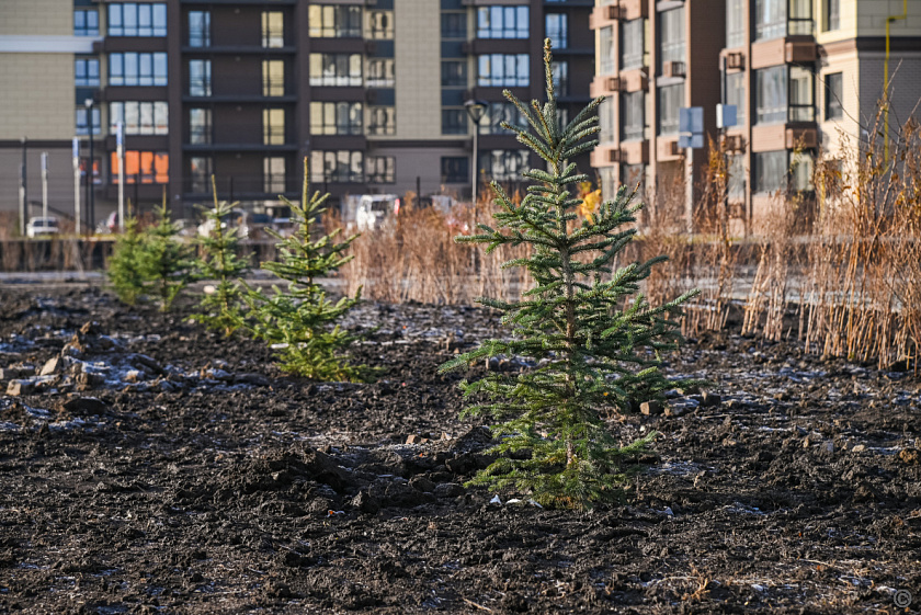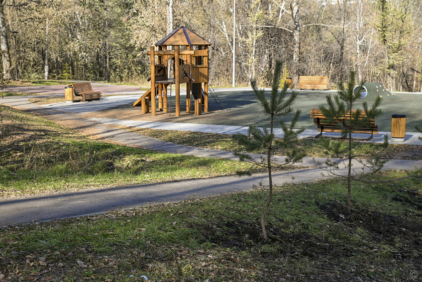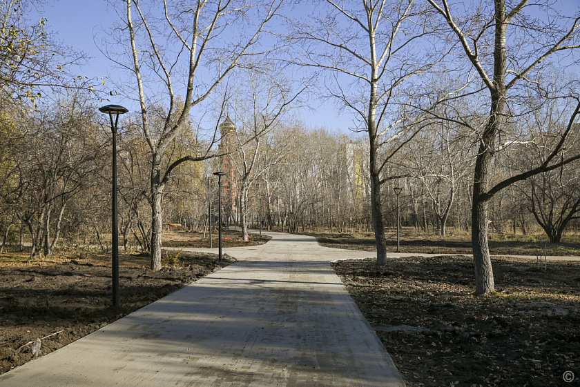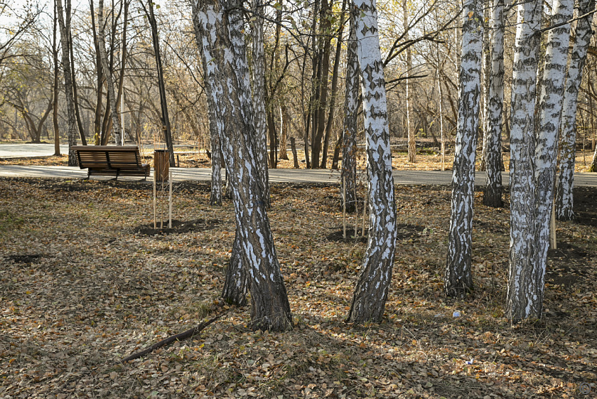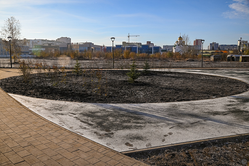 Ещё в этом общественном пространстве появился цветник, сейчас там сеют газон. На сегодняшний день специалисты активно озеленяют территорию: они уже высадили больше 750 деревьев, всего же предстоит посадить 2,5 тысячи саженцев.