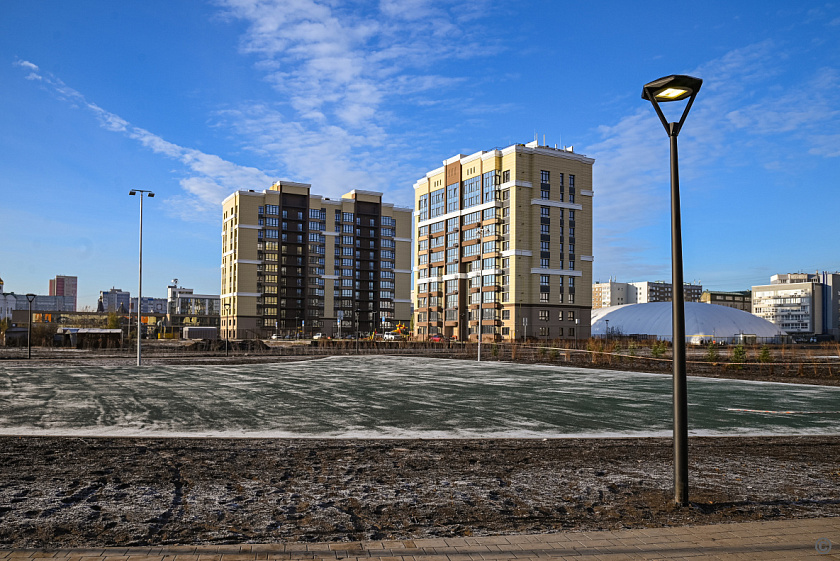 На Шумакова, 9 обустроили пешеходные дорожки, уложили на них плитку, а на будущих площадках — резиновое покрытие, высадили 190 деревьев. Подрядчик завершает монтаж освещения, работы по посеву газона и посадке кустарников. На данный момент их высадили около двух тысяч.