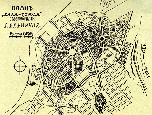 Всё же некоторые влияния идей «города-сада» сказались на облике Барнаула. В середине XX века своеобразный центр «города-сада» образовался рядом с площадью Текстильщиков.