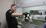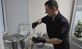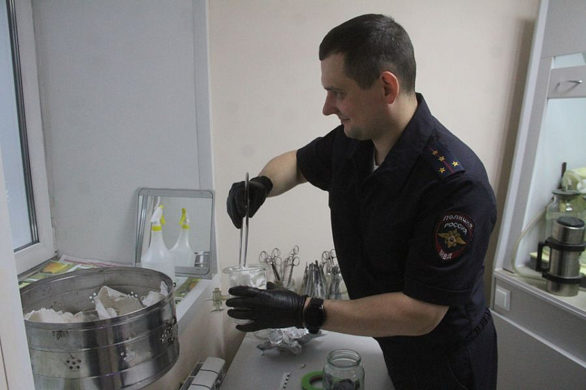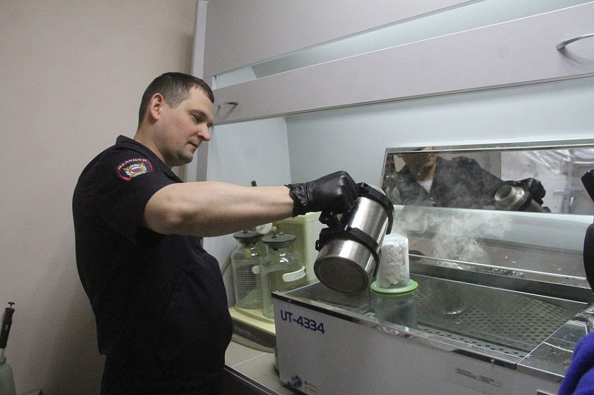 Эксперт по исследованию запаховых следов человека, капитан полиции Александр Вольных показывает оборудование — всевозможные стеклянные баночки, пинцеты, съёмники для снятия запаховых следов, хлопковые салфетки. Рядом на столе аппарат — водяная баня, и тут же ёмкость с жидким азотом. Всё это позволяет снять запаховый след с предметов, найденных на месте преступления.