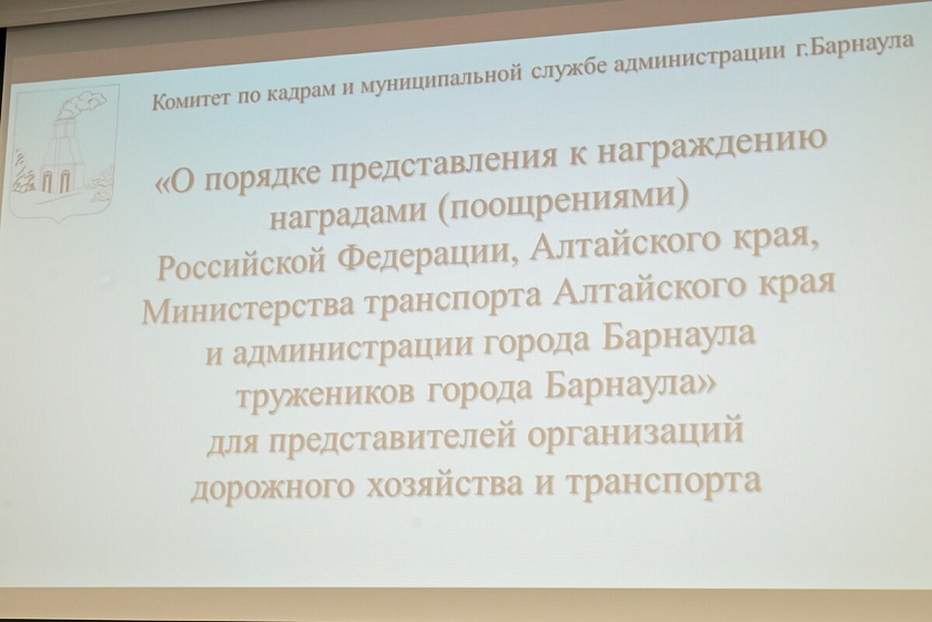 Практический семинар организован отделом развития муниципальной службы и наградной деятельности комитета по кадрам и муниципальной службе администрации города Барнаула. Мероприятие уже стало традиционным: проводится на протяжении трех лет дважды в год. В этот раз слушателями стали сотрудники организаций дорожного хозяйства и транспорта. Примечательно, что количество представителей отрасли, получивших награду того или иного уровня, по сравнению с прошлым годом возросло в два раза.