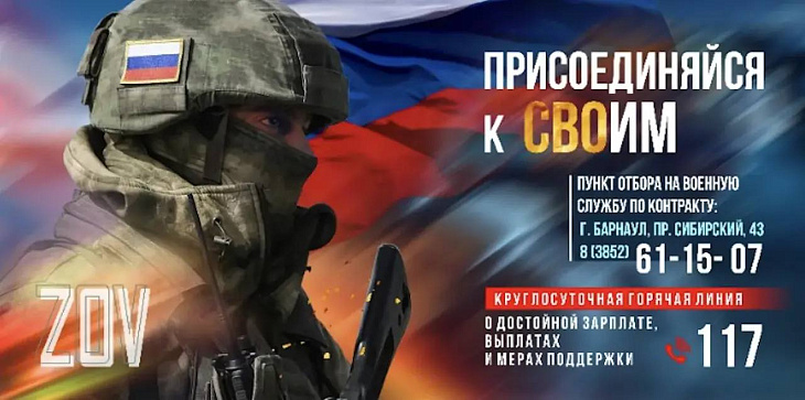 Круглосуточная горячая линия по вопросам службы по контракту — 117. Краевой пункт отбора на военную службу по контракту: Барнаул, проспект Сибирский, 43, телефон — (3852) 61-15-07.