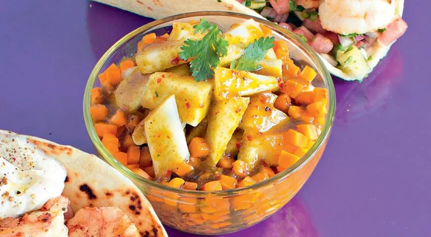 Как приготовить: дыню разрежьте пополам. Удалите семена и кожуру, нарежьте мякоть ломтиками толщиной 1 см. Смешайте кунжутное масло, соевый соус, оливковое масло. Мелко нарежьте зелёный лук и перец чили, очищенный от семян и перегородок. Разотрите овощи в ступке с чесноком (по желанию), солью и свежемолотым черным перцем до однородной кашицы. Добавьте масляную смесь, перемешайте до однородности. При желании разведите её еще оливковым маслом. Нарежьте мелкими кубиками 3 сочные морковки. Обжарьте на сухой сковороде 1–2 мин. до светло-золотистого цвета. Аккуратно смешайте с дыней и полейте заправкой. Дайте настояться 15 мин., украсьте листьями кинзы и подавайте.