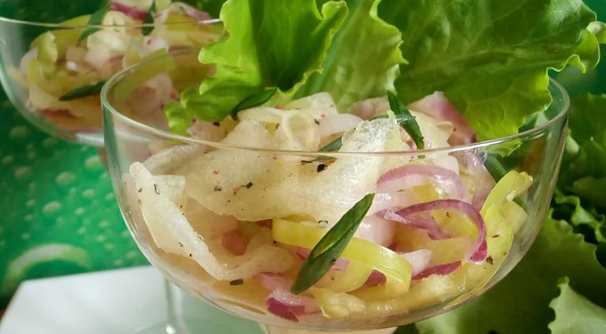 Как приготовить: сначала замаринуйте лук. Для этого луковицу нарежьте тонкими полукольцами. Переложите в миску, добавьте 1/3 ч. л. соли, сок лимона. Перемешайте руками, немного помяв лук, и оставьте на 1 час при комнатной температуре. Дыню разрежьте пополам. Удалите семена и кожуру, нарежьте мякоть тонкими и длинными полосками или лентами при помощи овощечистки. Зелёный перец разрежьте пополам, удалите семена и перегородки и нарежьте длинной соломкой. В миске аккуратно перемешайте дыню, маринованный лук, сладкий перец и листья салата, которые нужно нарвать средними кусочками. Сбрызните оливковым маслом. Посолите и поперчите. Перемешайте. Подавайте на листьях салата.