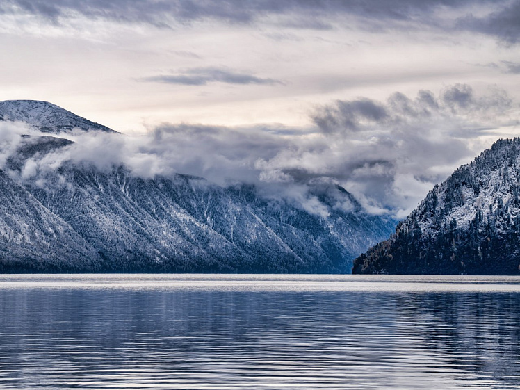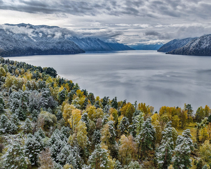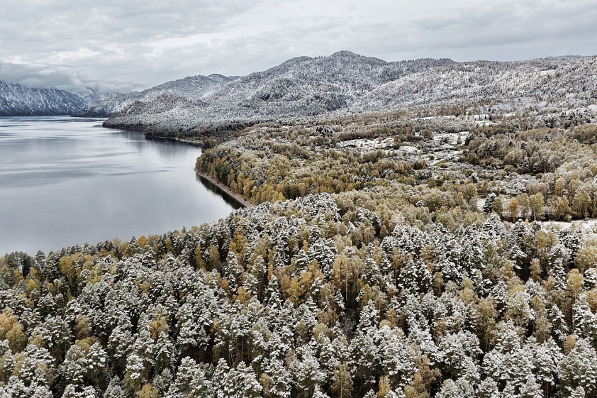 На побережье Телецкого озера короткая золотая осень сменилась зимними мотивами.
