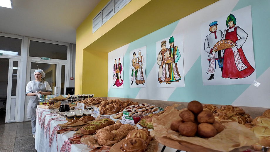 Среди угощений — белорусский дзяд с яблочным повидлом, алтайский чай, русские блины и ватрушки, дагестанское чуду с творогом, армянский назук с ореховой начинкой, казахские баурсаки, немецкий кухен с конфитюром и татарский эчпочмак с мясом.