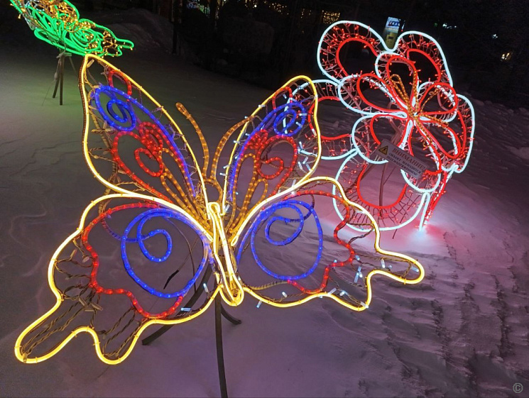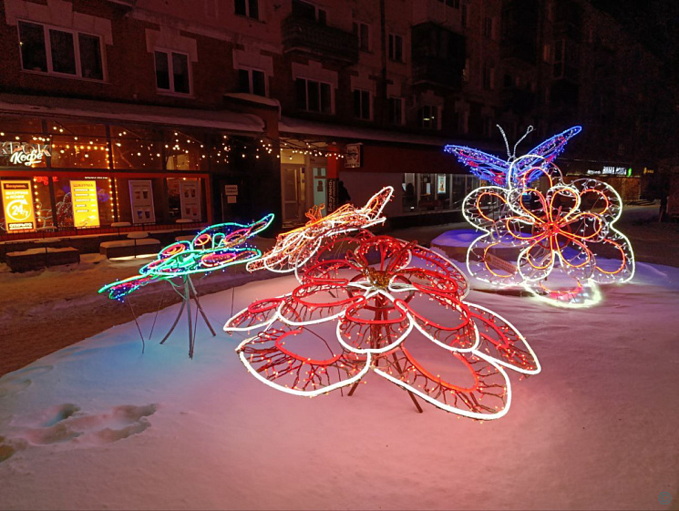 На участке проспекта Ленина от улицы Димитрова до площади Октября разместили световые инсталляции: две изящные бабочки, три светящихся цветка, а также фигуры «Ёлочка» и «Подарок». Улицу Профинтерна украсили аналогичными композициями.