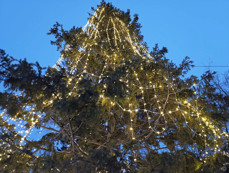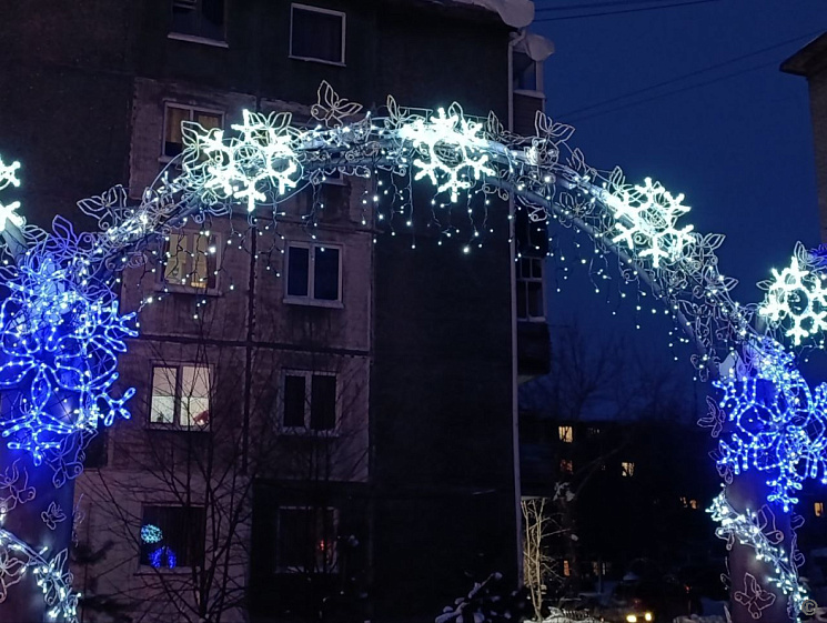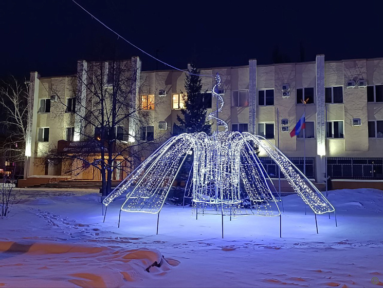 Особое внимание уделили въездной зоне со стороны старого моста и созданию районного новогоднего городка. На проспекте Комсомольском установили световой фонтан и украсили арку гирляндами и снежинками. Здесь же разместили композицию «Ёлочка и новогодний подарок».