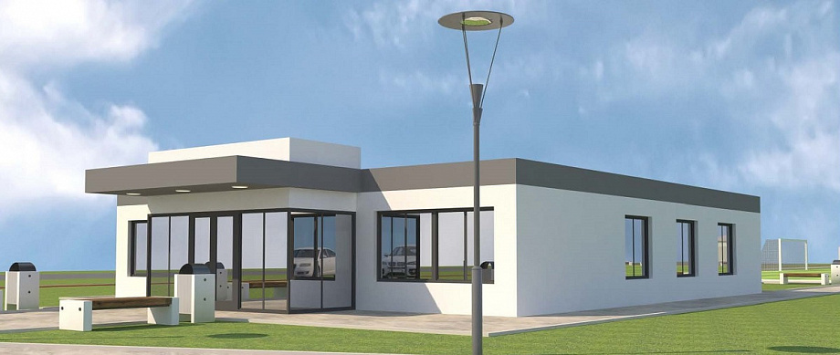 Возле административно-бытового здания запланировано семь парковочных мест, 10 машино-мест разместят на парковке под навесом. Здание склада будет из сэндвич-панелей белого цвета с серым парапетом. У административно-бытового комплекса по проекту вечерняя подсветка по периметру парапета, в районе входной группы также будут подсвечены вертикальные декоративные элементы на фасаде.